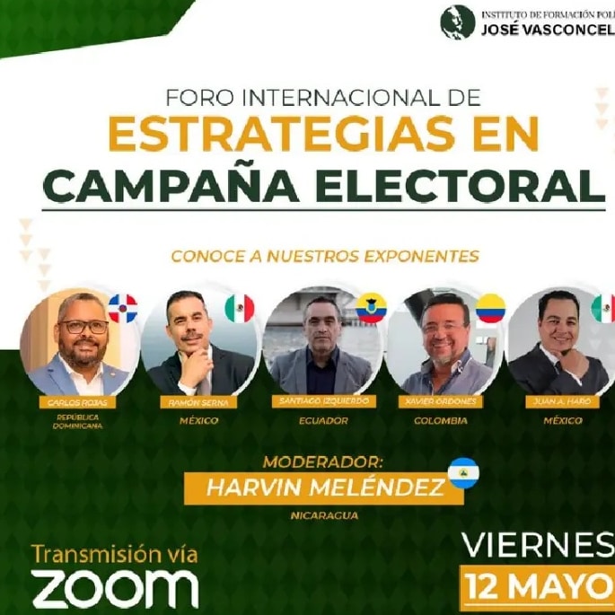 El Instituto de Formación Política José Vasconcelos y Asesores Internacionales Estratégicos, promueven el Foro Internacional sobre Estrategias de Campañas Electorales, que será realizado en la modalidad Zoom, el próximo viernes 12 del presente mes de mayo.