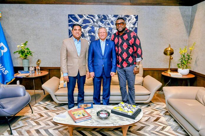 El presidente ejecutivo de Banreservas, doctor Leonardo Aguilera, recibió en su despacho al astro del béisbol y miembro del Salón de la Fama de las Grandes Ligas, David Ortiz, junto al ministro de Deportes y Recreación, Kelvin Cruz. Durante el encuentro, reafirmó el apoyo de la institución al deporte dominicano en todas sus disciplinas, destacando su papel como motor de desarrollo y orgullo nacional.